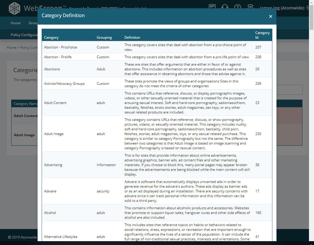 The Categories page can be accessed via Policies >> Categories & provides a simple overview of how all available categories are defined within each policy.