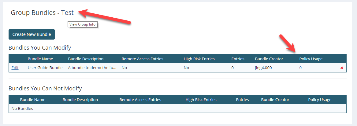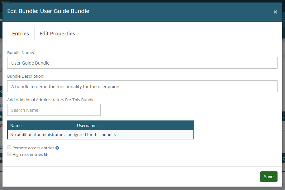 •Bundle Name •Bundle Description •Whether or not you want to optionally add administrators to the bundle. •Whether you intend to add remote access or high risk entries into the bundle.