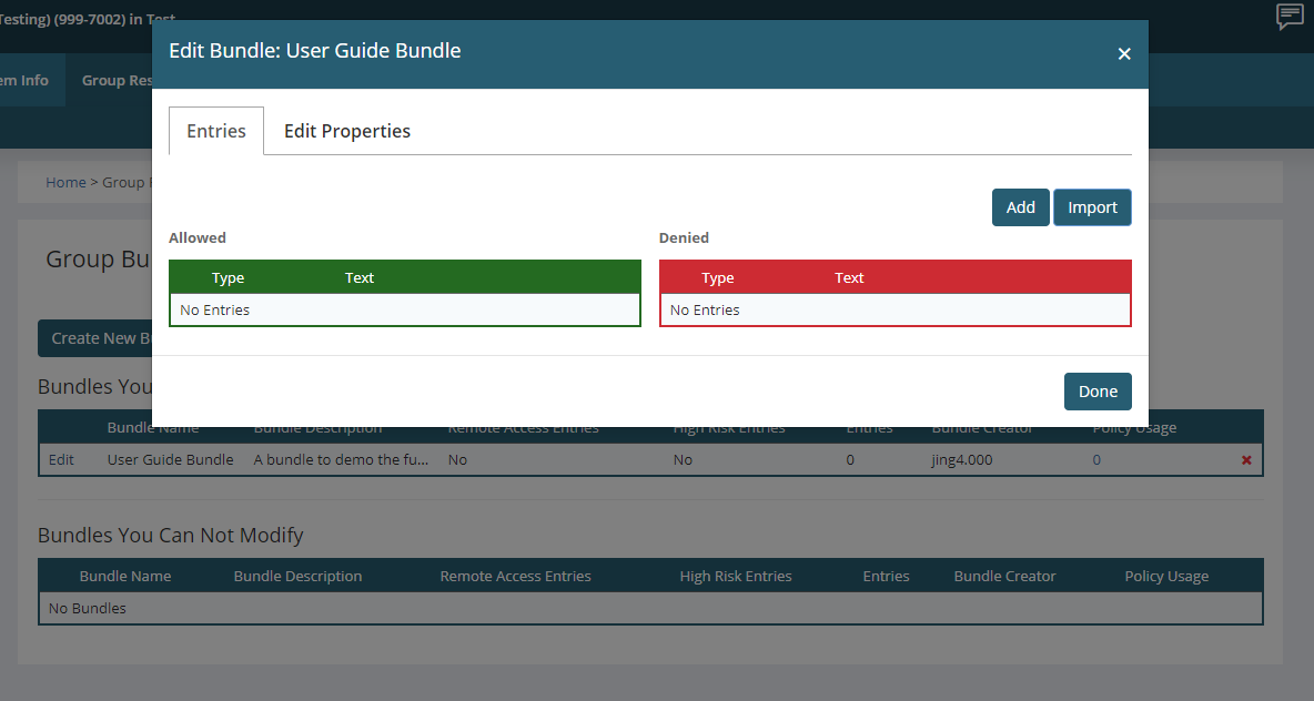 On the Entries tab, you are able to modify what the contents of the bundle is - what is allowed & what is denied.