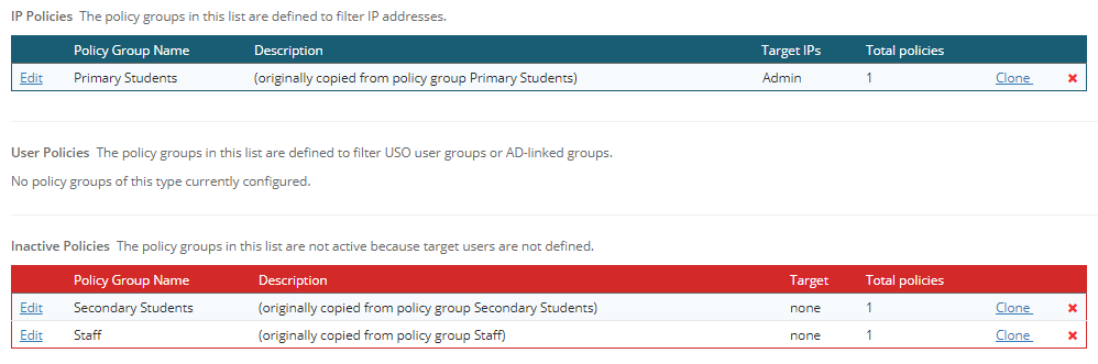 The enabling process creates three policy groups. Each policy group starts out by containing one filtering policy but more policies can exist within a group. All policies within a group target the same users (i.e. IP addresses or users).