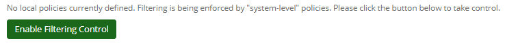 •Certain settings are defined at the system level and cannot be changed by your establishment. These settings are available to view for your information. •Certain elements available to you are managed at the system level. You may choose to use them if they are of benefit to you. •If you do not enable local filtering control, your establishment will still be filtered by the system policies operating in the background. This is the least flexible option so it is strongly advised that local control is enabled to allow your establishment to customise your filtering settings. |