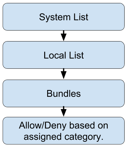 Order of processing When visiting a website the system will perform a check on the policy being used to see whether the website should be allowed or denied. There are a number of different ways websites are allowed or denied. These are: •System List - the global allow/deny list •Local List - the allow/deny list for the establishment •Bundles - containers of URLs that can be created by your establishment, a group you are part of or at the system level. •Categories of websites.